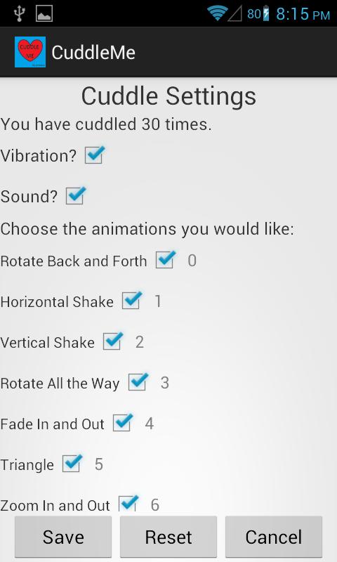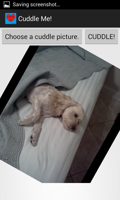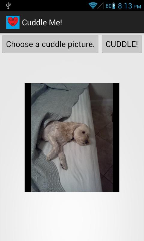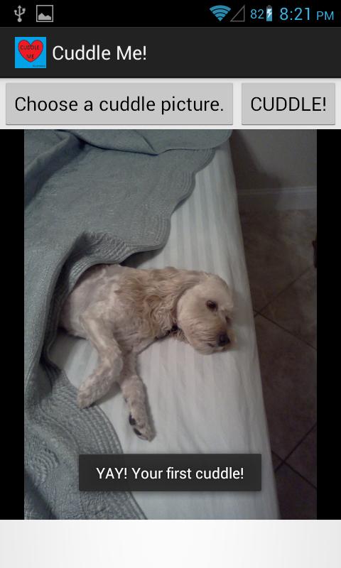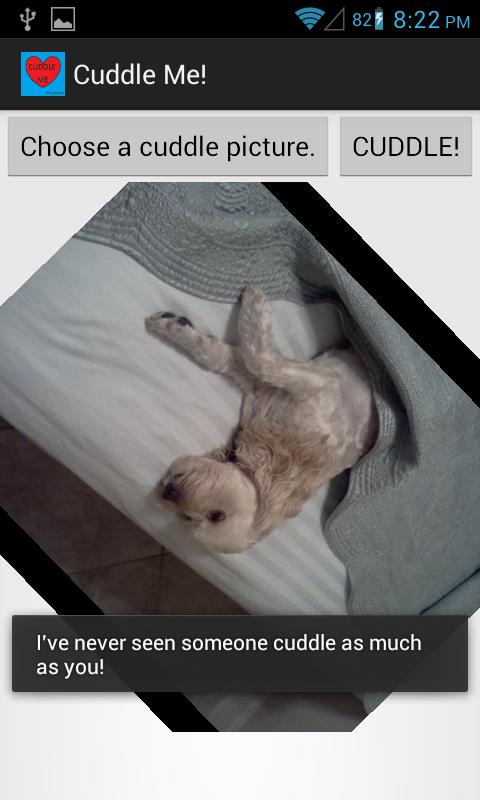 Ever want to cuddle someone when they're not there? Try cuddle me! Select a picture of your loved one (or an unwilling participant) and click Cuddle Me! and enjoy the app!