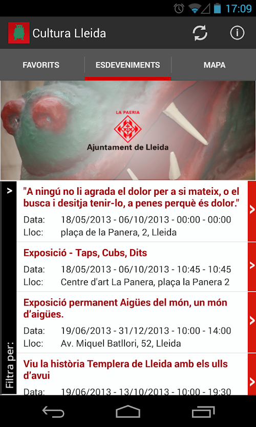 Amb aquesta aplicació podràs estar informat de tots els esdeveniments que tindran lloc a la ciutat.Official implementation of the Department of Cultural Promotion, Museums, Festivals and Popular Culture of the City of Lleida.