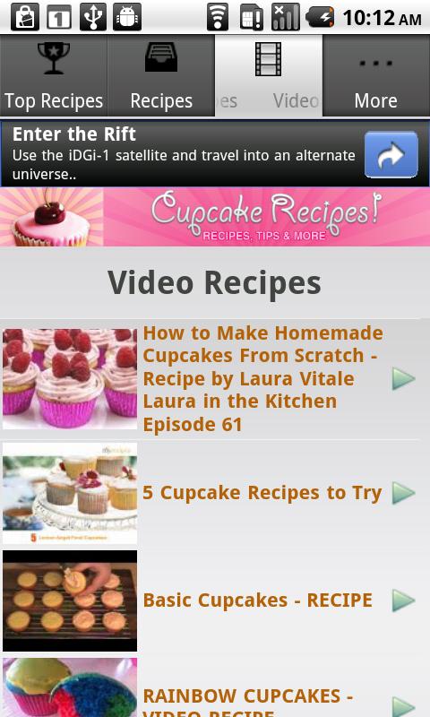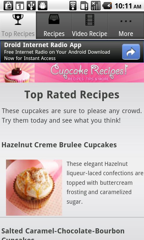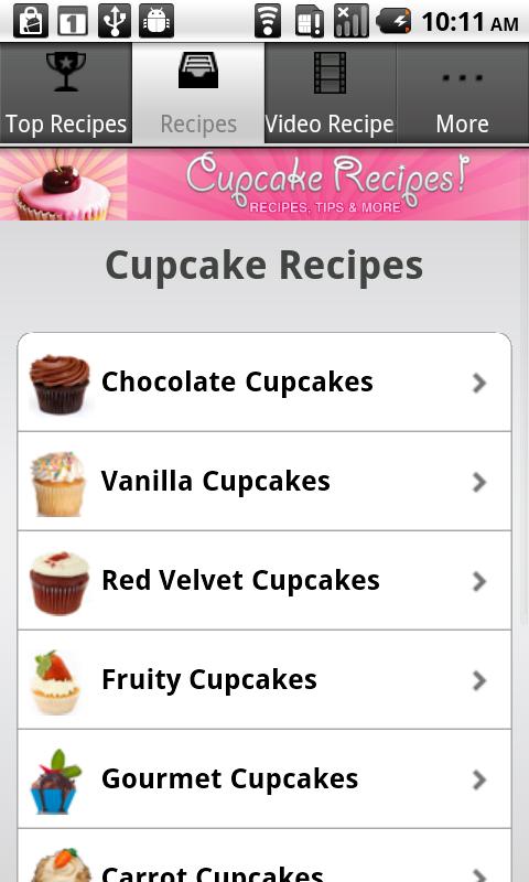With this robust and enlightening Cupcake Recipes app, not only will you a list of our favorite top rated recipes, but you'll also find many recipes broken down into convenient categories according to they type of cupcakes you're looking to make. Video recipes will show you exactly what to do, and with our Video Decoration Tips you can create fantastic looking cupcakes that will wow your friends and family.