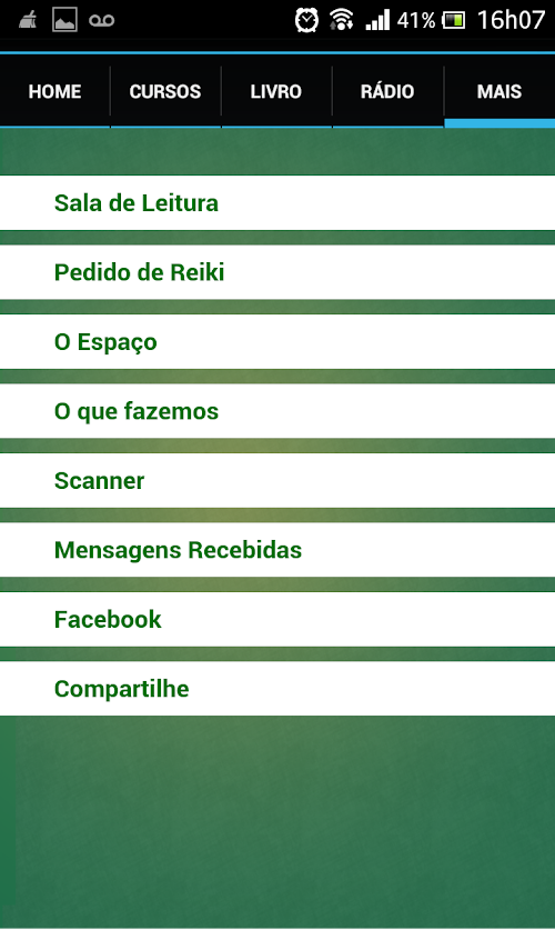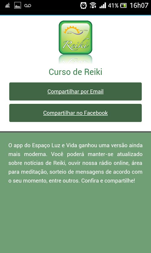 Você poderá manter-se atualizado sobre notícias de Reiki, ouvir nossa rádio online, área para meditação, sorteio de mensagens de acordo com o seu momento, entre outros. Confira e compartilhe!You can keep up to date on news Reiki, listen to our online radio area for meditation, draw messages according to your time, among others. Check it out and share it!