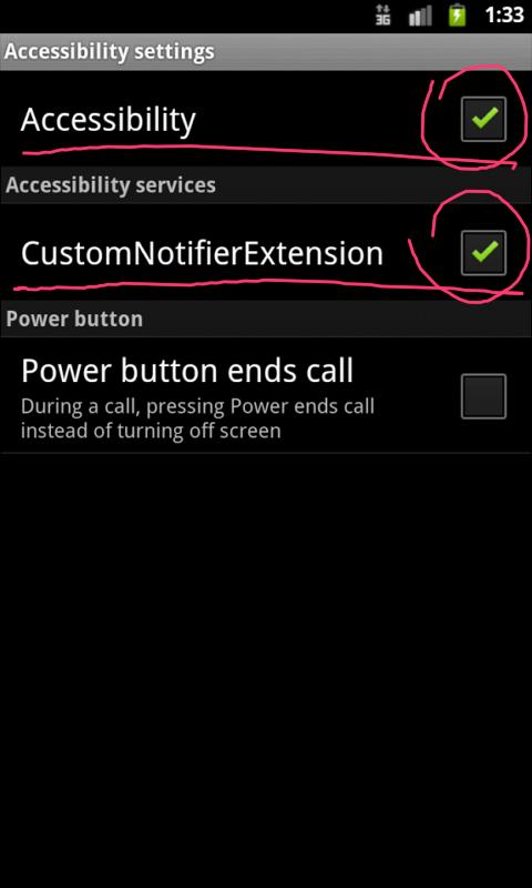 After installation, the configuration of the Android "Accessibility" and "CustomNotifier Extension" Please enable.
