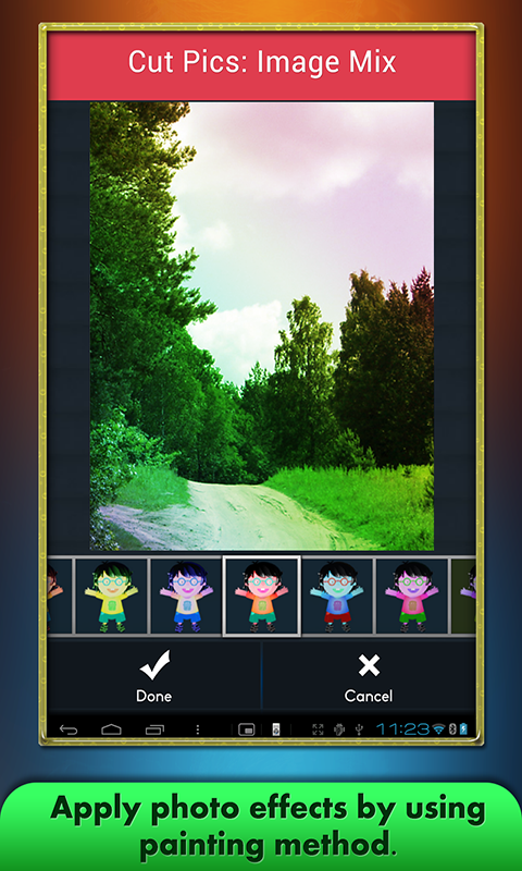 In this image crop app take any part from one picture and add it to another. Remix your pets into an unreal creature, swap a statue's head with your friend's, or make beautiful works of art. Cut Pics image mix has the power and features of a professional creative tool, it’s the best photo editing app for put image on image. There are lots of photo effects are available for your pictures like Autumn, Contrast, Pencil, Desert, Reflection, Shadow, Saturation, Sharpen,etc.