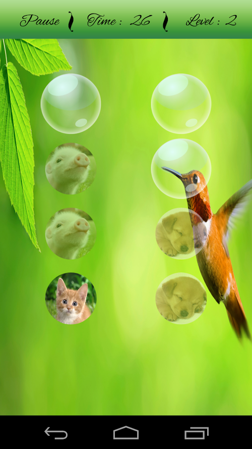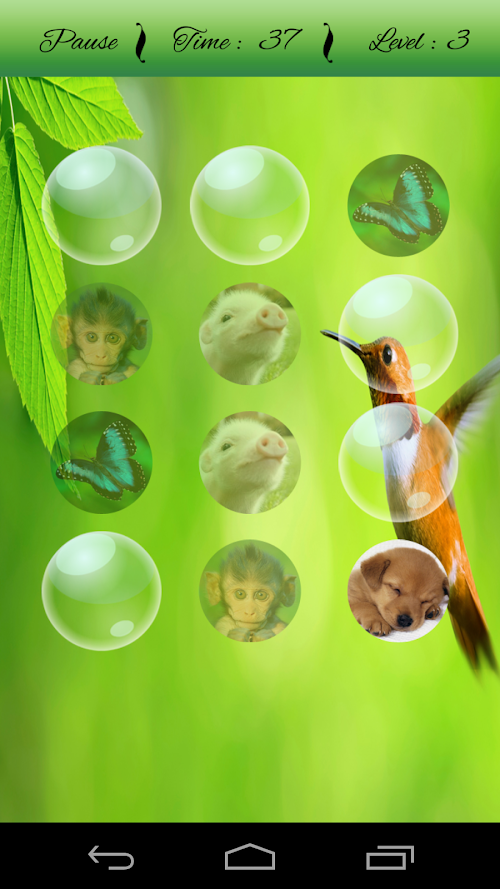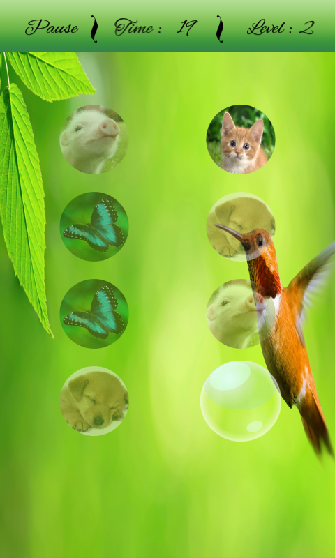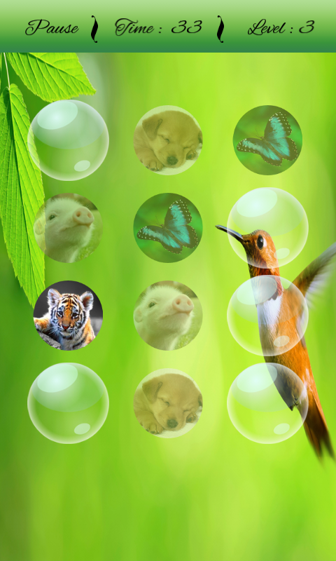Cute Animals Matching Game is very cool addictive matching puzzle game for kids, adults and everyone for improving your focus and concentration. It has various animals characters for matching. Touch on Bubble with your memory to match the correct character. Complete each level within given time. The number of bubble increases with every level. It has dogs, cats, butterfly, tigers, birds etc characters for Matching with your memory.