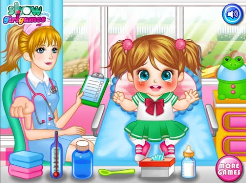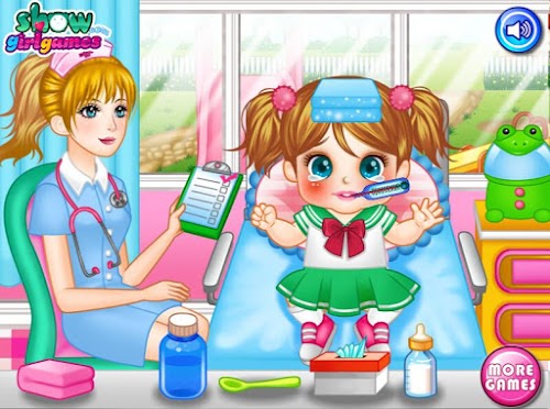 Cool autumn weather is very comfortable ,and it's very fit for any outdoor activity .Shelly often takes her cute baby go to park or children's playground .And the baby always feeling very happy there. Today ,a new children's park open to the public,so Shelly drive her family to there.Now the cute baby is playing the children's Sliders and she is very happy.But a little hot,so Shelly help the cute baby take off the coat.But the baby feel bad when they are going to eat lunch. Shelly is very worried ,and she take her baby go to the hospital .The doctor check the baby heartbeat and takes her temperature .Oh ,it's not bad.The baby is just a cold fever ,so the most important is bringing down her temperature.So the doctor gives her some children's cold medicine .and then the doctor treat her rhinitis .The baby feel better now .The baby need put on more clothes,let's help her dress up.If you are a mother,what should you do when the baby caught fever? Play the“cute baby cold doctor”and learn how to take care of the baby.