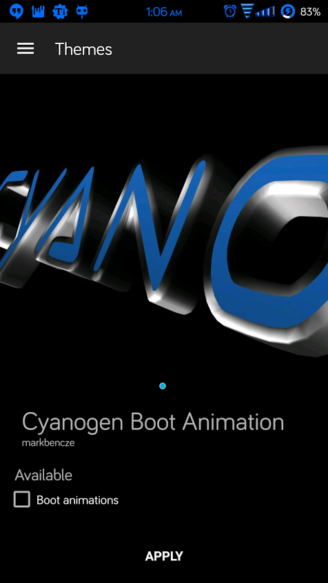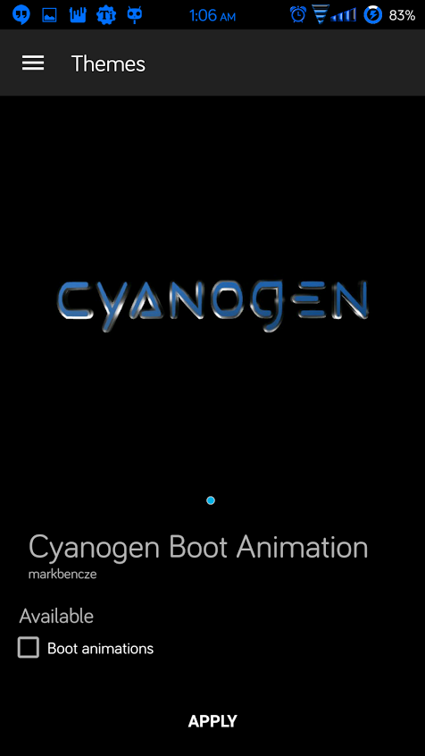 This is a custom boot animation for Cyanogen fans. It is inspired by Cyanogen's new logo. You must be running a rom with CM12 theme chooser or it will not work. It should work on all devices. To apply simply go to themes and select the menu button near the top left and select boot animations. You can apply it from there