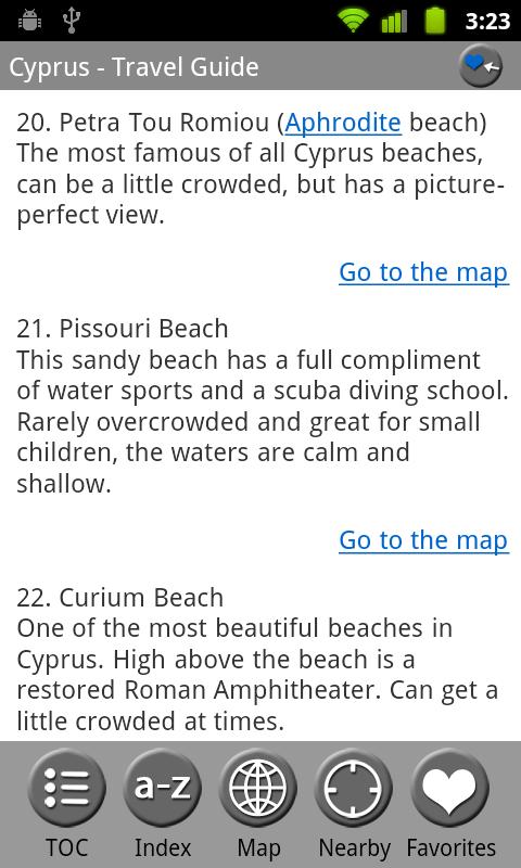 This fully-functional guide is absolutely free. The full version (only $4.99) adds Text-To-Speech and expands articles with more information about attractions, history, culture, itineraries, phrasebooks and more. Listen to complete articles on the go with Text-To-Speech: double-tap on a word to start Text-To-Speech from the selected word or select Menu > Start Text-To-Speech.