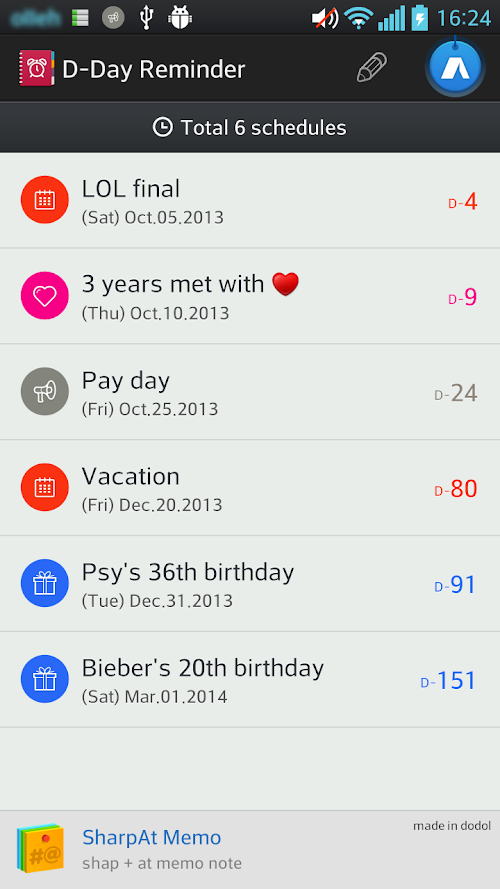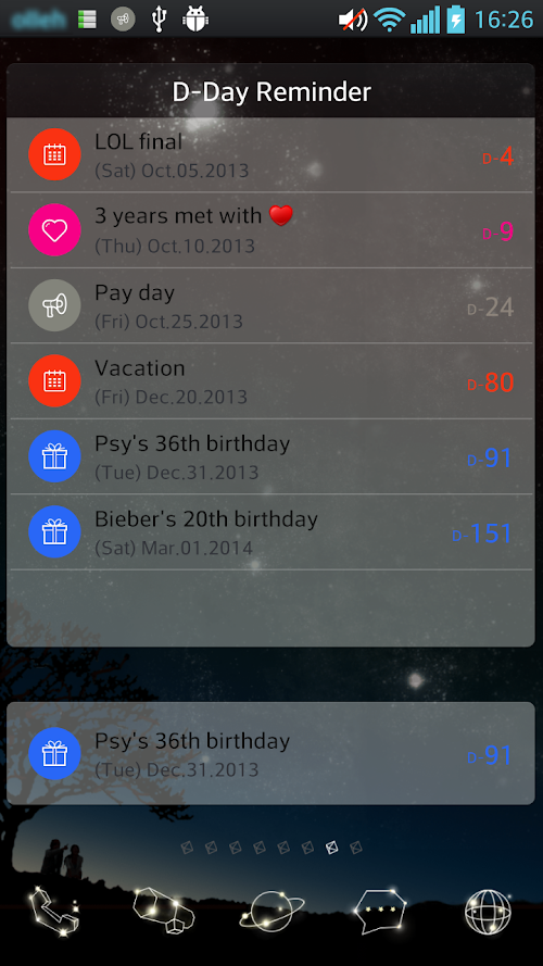 Also, when the date come close to you, D-Day Reminder will reminds you in advance. You will never miss the day.