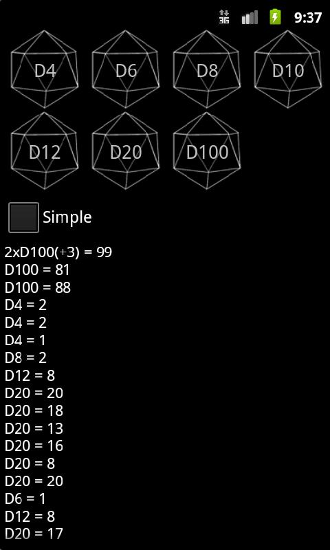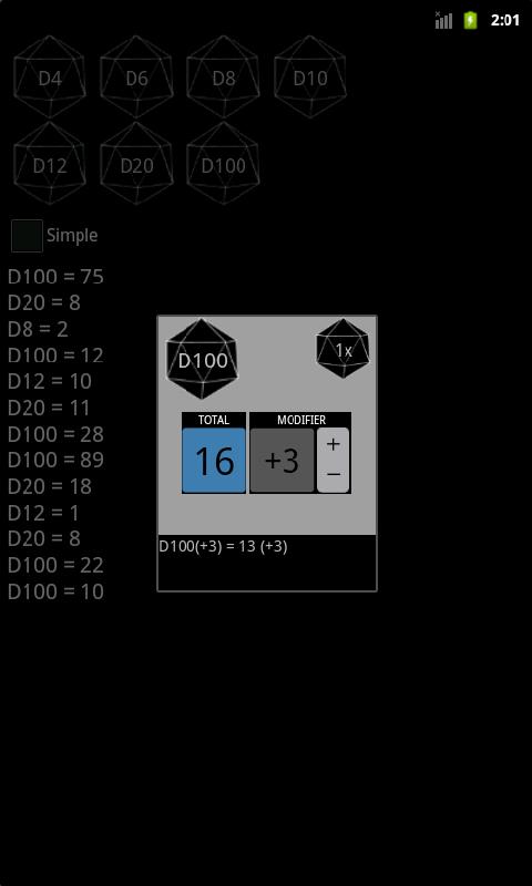Easily roll dice from the D20 gaming world. Supported die include d4, d6, d8, d10, d12, d20, d100, and Coin Flip. There is a log to keep track of recent rolls. There is also an easy way to add modifiers to the dice rolls. There are quite a few D20 Dice apps on the market. This one is designed to be simple and efficient.