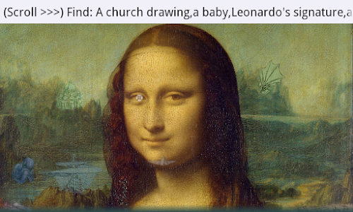 Find the many objects and clues hidden in Leonardo Da Vinci's paintings and drawings. Scroll down the picture or across the list of items at the top. Can you find all 63 items?