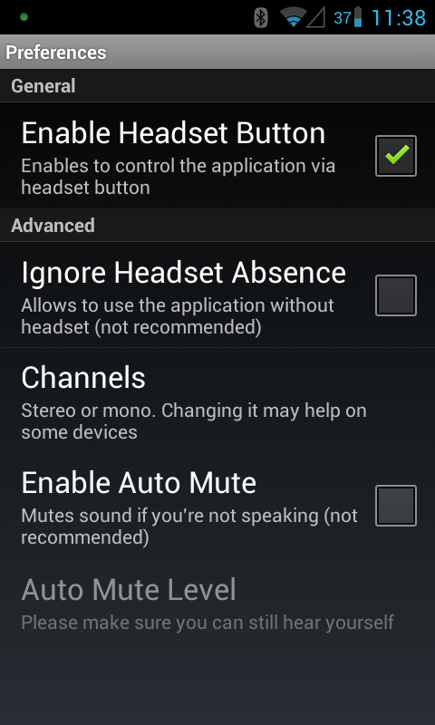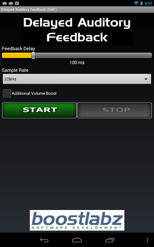 This android application implements Delayed Auditory Feedback (DAF) technique, which is known to help people with stuttering to speak more fluently. The application works by recording the speech through your headset, applying this technique and playing the delayed audio back to you. Frequency Altered Feedback (FAF) is not currently supported, but it will be soon.