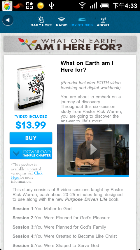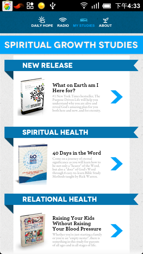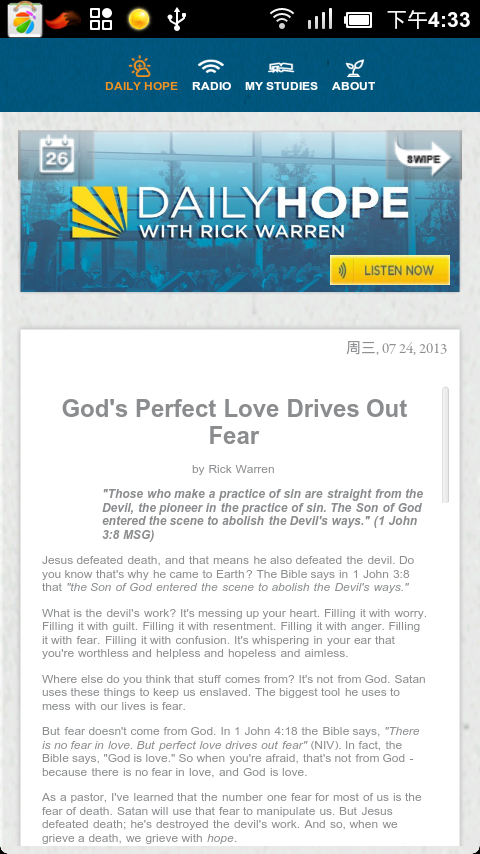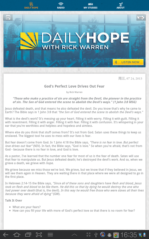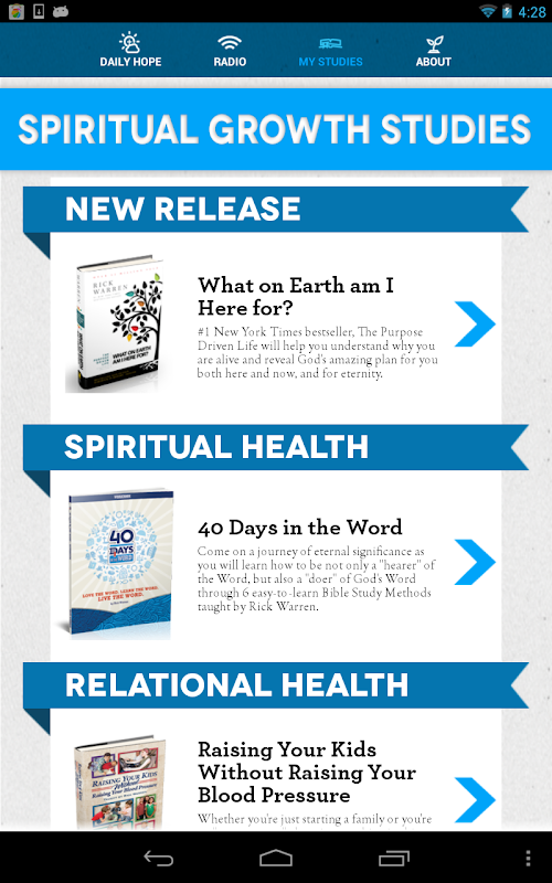 The Daily Hope app is an easy way to get Pastor Rick’s free Daily Hope devotional delivered to you every morning, digital versions of his most popular small group studies, and a new 25 minute Daily Hope radio broadcast every day that will connect you to the powerful hope in God’s Word.