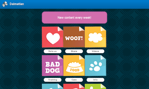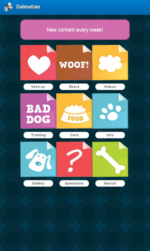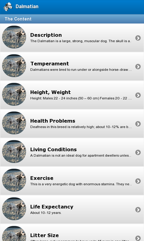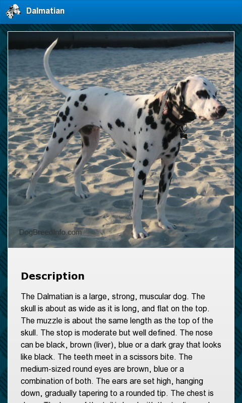 Dalmatian dogs, app for Android. If you own a Dalmatian or you plan to buy a puppy soon, this Dog Breeds app is for you. Enjoy the beauty of this dog breed from your mobile phone or tablet. Includes dozens of dog pictures, photos and wallpapers, information about your dog, training lessons and more. Detailed contents: