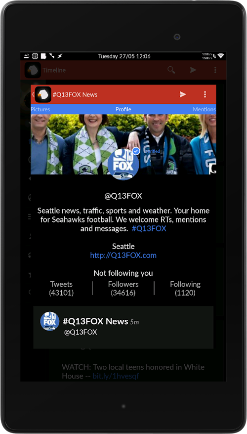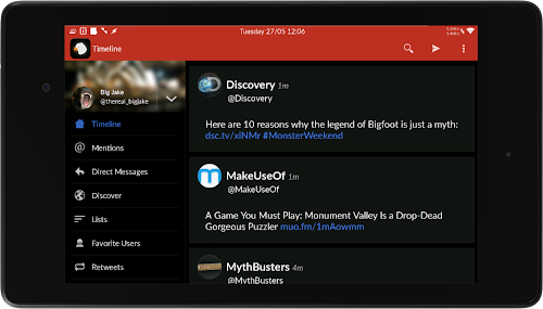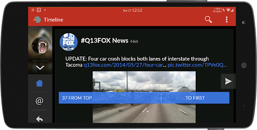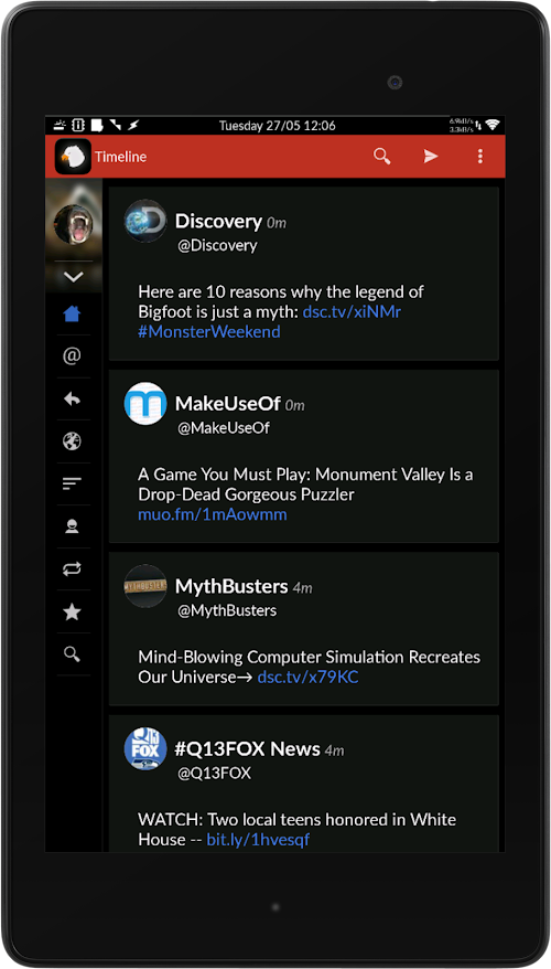 This is a red theme for Talon for Twitter with blue accents and full image preview on the timeline.