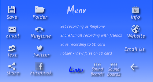 SOUNDBOARD - NO soundboard included, but Soundboard button on main screen will run ANY app (Menu-Soundboard to select one of your installed apps). We do not advocate violation of copyright content. It's USE as a REFERENCE (feedback for improving parody effect or voice impression) MAY OR MAY NOT fall within FAIR USE.