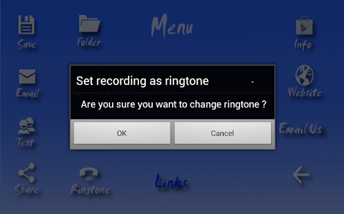 FREE FILE MANAGER - Menu - Folder shows record.wav (Record/Play), recordlive.wav (LIVE) files. DarthTalk folder contains audio files you have saved, and every audio file you have shared or e-mailed. We use the OPEN SOURCE and FREE OI File Manager app by openintents.org - you will be sent to Google Play to download it when needed.