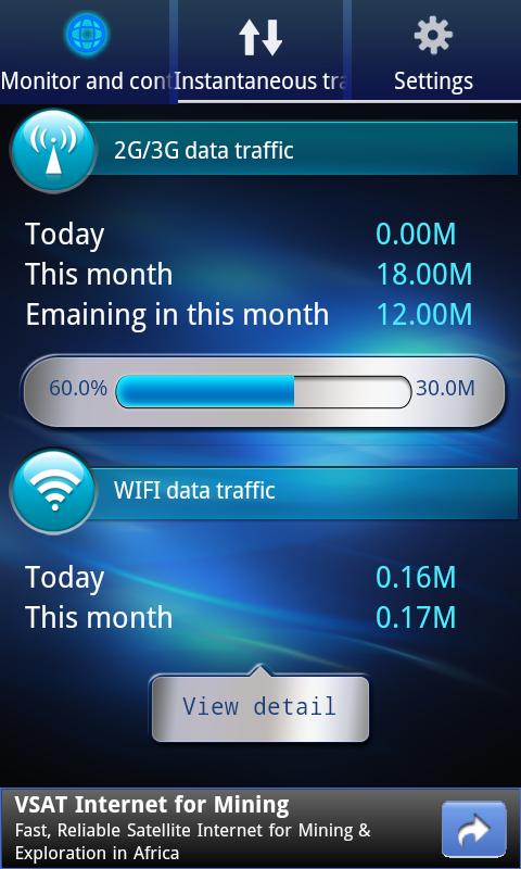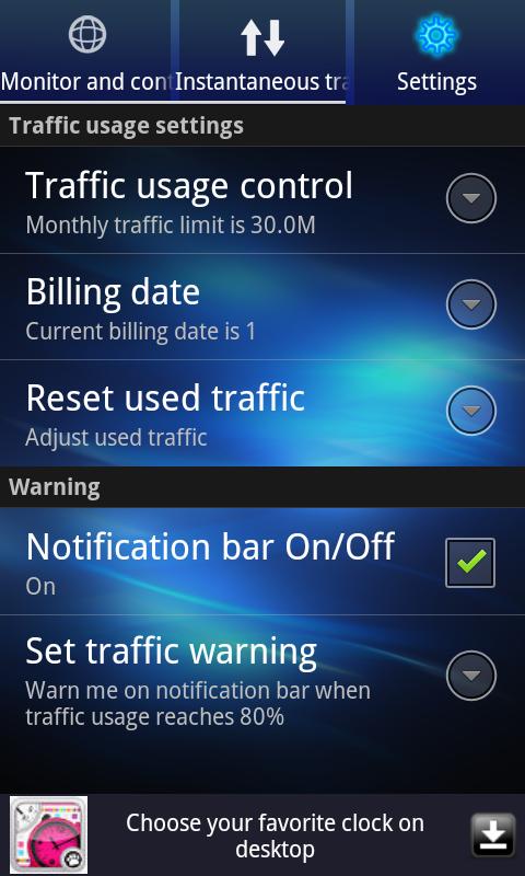 1. Data traffic monitor: check the data traffic of 2G/3G and Wi-Fi. It can also provide data traffic warning function which will warn you on notification bar when the data traffic is close to the value you set.