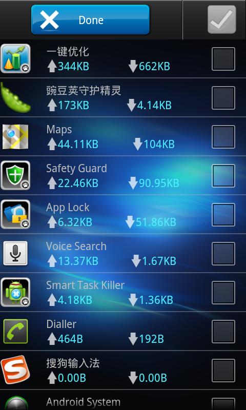 2. View detail: you can view data traffic that any single app occupies, and you can also stop the running of data-guzzling apps to cut down your data traffic.