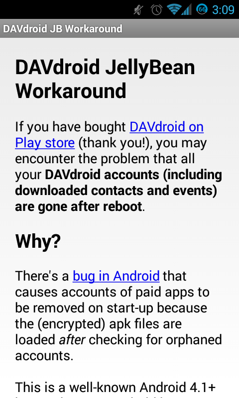 This workaround is free, and the bug only affects paid (and therefore encrypted) apps. So please install it, and the workaround fakes a DAVdroid sync adapter so Android doesn't delete DAVdroid related data.