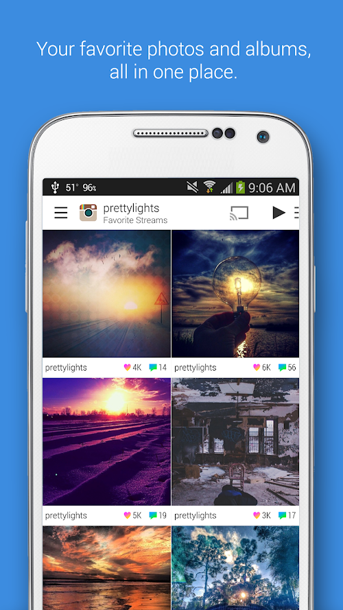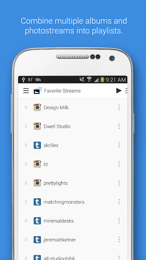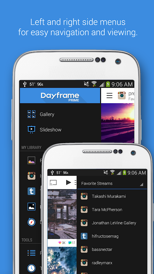 Dayframe works with your favorite photo sharing services to provide a ongoing slideshow of friends, family, and interests. Browse and share photos between Facebook, Instagram, Tumblr, Google+, Dropbox, Flickr, Twitter, 500px, and more.