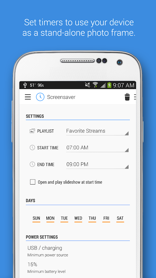 You pick the best time to play as a screensaver, along with settings for network, battery level, and power source. The app won’t run all night or drain your battery / bandwidth.