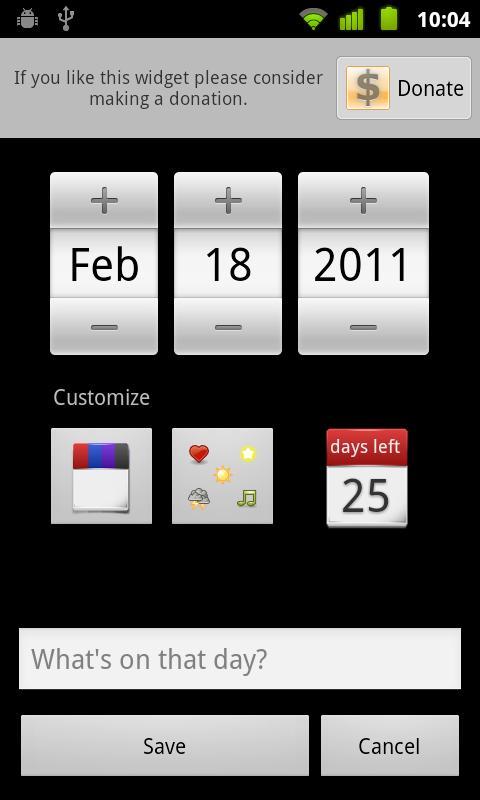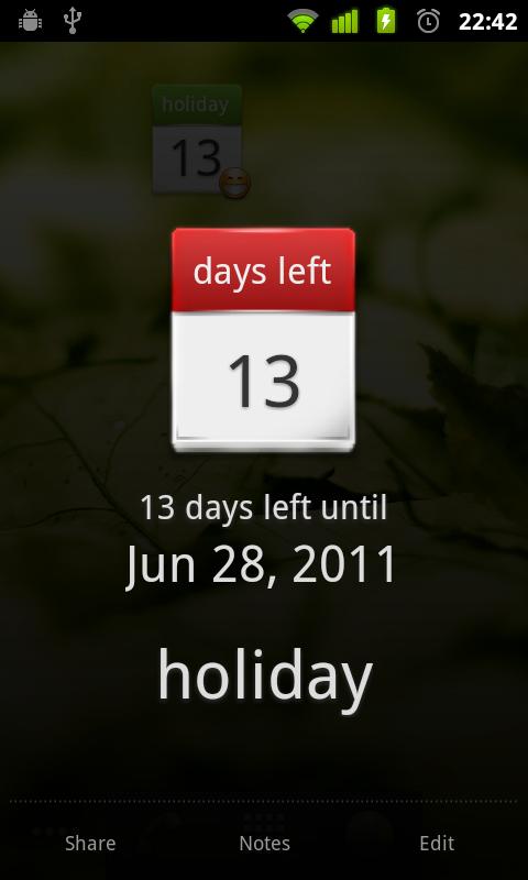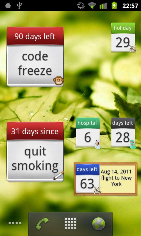 Help yourself with this shiny new little widget for your home-screen. Never miss an important day again. Set up an daily countdown to new years eve, to Christmas, to your birthday or to a totally random day - just because you like daily countdowns!
