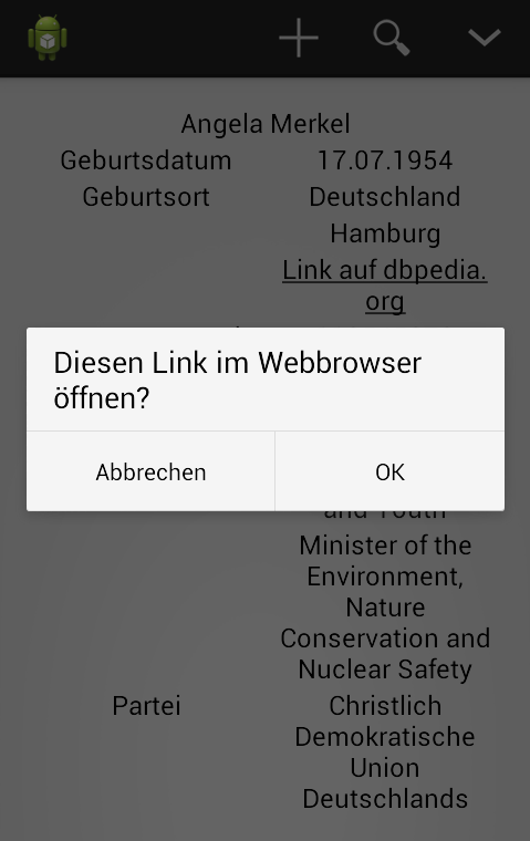 With the DBpedia crawler, data can be retrieved from Wikipedia articles. DBpedia (www.dbpedia.org) stores the data of the info boxes, this app presents them in a tabular layout. Titles can be searched with or without specifying properties, search criteria such as birth date and birth place or class affiliations like "president" or "chancellor" are also supported. Apparently the server can not process more than 3 criteria at once.