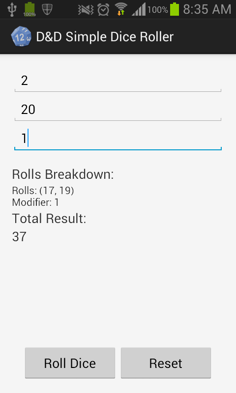 This version of D&D (DnD) Simple Dice Roller Android App comes with one universal variant which will work on all the Android devices.