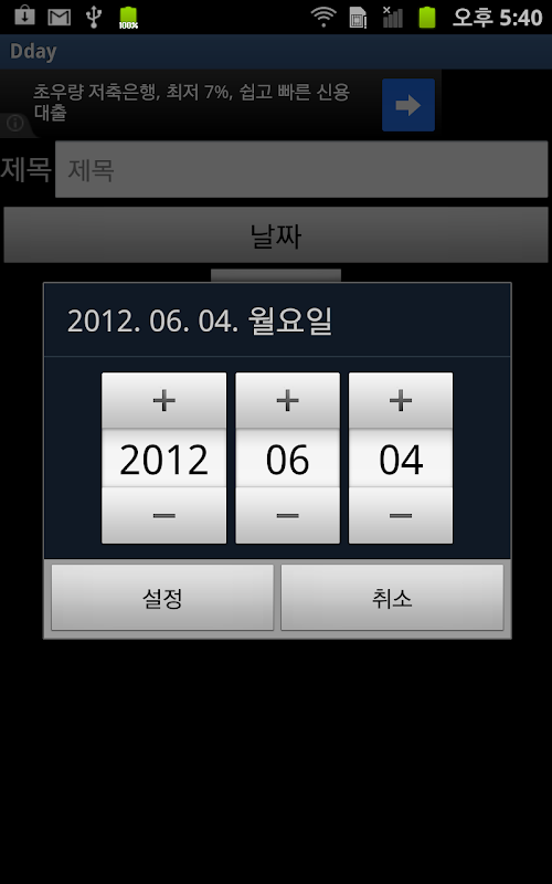 2. 설정화면에서 제목을 적어 넣고 날짜 버튼을 클릭하여 날짜를 선택합니다.