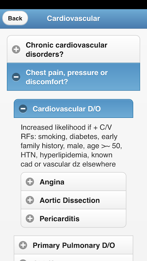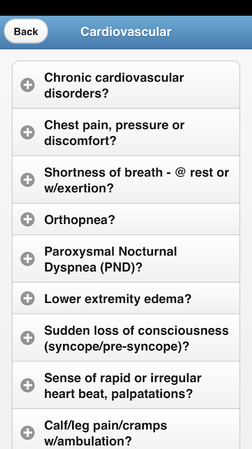 - This app can also be used as a Review of Symptoms guide, with common questions grouped by organ system. Specific diagnoses to consider for any positive result follow each question.