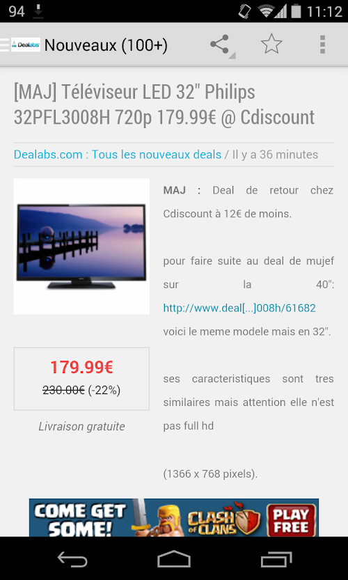 Pour éviter de surcharger la mémoire de votre téléphone ou tablette, n'hésitez surtout pas à SUPPRIMER les deals déjà lus ou plus anciens. Pour faire ceci, il vous suffit d'appuyer sur Hot ou Nouveaux -> sur les 3 points en haut à droite -> tout supprimer. Répétez cette opération plusieurs fois si nécessaire.