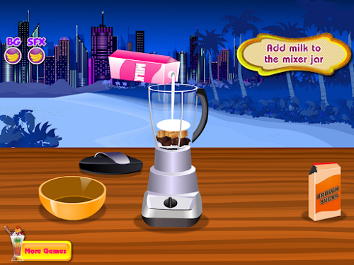 Already it is summer which means it's time for refreshments. Today we will prepare one of the most refreshing summer beverage, but we can not do this alone. In this game you have to help us to prepare these beverages. First you have to buy some fruit to be prepared drink so we buy some apples, grapes, cherries, strawberries, bananas and papaya. To prepare the first kind of drink should cut each fruit into small pieces and then to add a mixer to mix. Then we put a piece of ice cream on top and some decor items, and we see that flooding is ready. Then you must prepare a milk shake, so we add a little water and umpic cocoa in a bowl, so you can mix better. Then we put in forms and we refrigerate for a few minutes to cool. Then add to the blender with some milk and a few tablespoons of sugar, in order to prepare the cream. We notice that the milkshake is ready, so we started making the third drink, namely peanut juice. You need to put milk, sugar, vanilla extract and cocoa butter and little nuts in a mixer to prepare this fabulous drink. Need to prepare and orange juice, so we clean and we have to cut into small pieces, so you can put it in a blender. You must add oranges, some water, and a piece of sugar to make a wonderful juice. Thank you for your help and invite you to choose and other games for girls to see if you're doing as well as you did here.