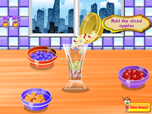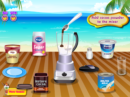 Already it is summer which means it's time for refreshments. Today we will prepare one of the most refreshing summer beverage, but we can not do this alone. In this game you have to help us to prepare these beverages. First you have to buy some fruit to be prepared drink so we buy some apples, grapes, cherries, strawberries, bananas and papaya. To prepare the first kind of drink should cut each fruit into small pieces and then to add a mixer to mix. Then we put a piece of ice cream on top and some decor items, and we see that flooding is ready. Then you must prepare a milk shake, so we add a little water and umpic cocoa in a bowl, so you can mix better. Then we put in forms and we refrigerate for a few minutes to cool. Then add to the blender with some milk and a few tablespoons of sugar, in order to prepare the cream. We notice that the milkshake is ready, so we started making the third drink, namely peanut juice. You need to put milk, sugar, vanilla extract and cocoa butter and little nuts in a mixer to prepare this fabulous drink. Need to prepare and orange juice, so we clean and we have to cut into small pieces, so you can put it in a blender. You must add oranges, some water, and a piece of sugar to make a wonderful juice. Thank you for your help and invite you to choose and other games for girls to see if you're doing as well as you did here.