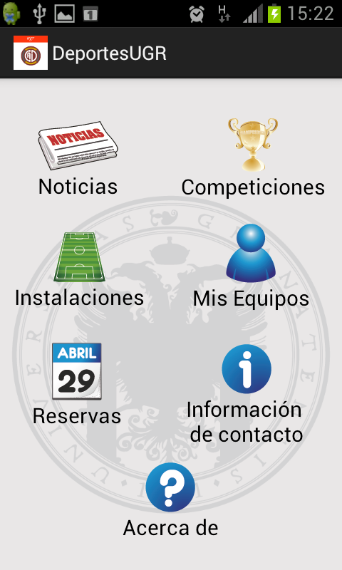 La Universidad de Granada recoge en la página web http://apps.ugr.es un listado de las principales aplicaciones para móviles que se desarrollan en el seno de la institución y que se distribuyen de forma gratuita. Las aplicaciones están destinadas a usos docentes, investigadores o de gestión, y tienen como finalidad informar o mejorar los servicios que se ofertan desde la UGR.DeportesUGR is an application that allows access to the web page of the Center for Sports Activities at the University of Granada. With it you can: