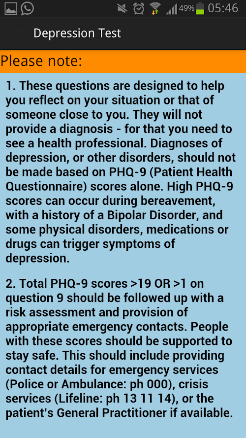 2. Total PHQ-9 scores >19 OR >1 on question 9 should be followed up with a risk assessment and provision of appropriate emergency contacts. People with these scores should be supported to stay safe. This should include providing contact details for emergency services (Police or Ambulance: ph 000), crisis services (Lifeline: ph 13 11 14), or the patient's General Practitioner if available.