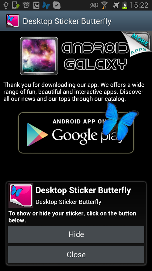 N'hésitez pas à nous contacter par e-mail, si votre téléphone n'est pas pris en charge ou si vous rencontrez des problèmes. Nous répondrons à votre demande le plus rapidement possible."Desktop Sticker Butterfly" is an original and surprising application, you open any other application that it will always be visible.