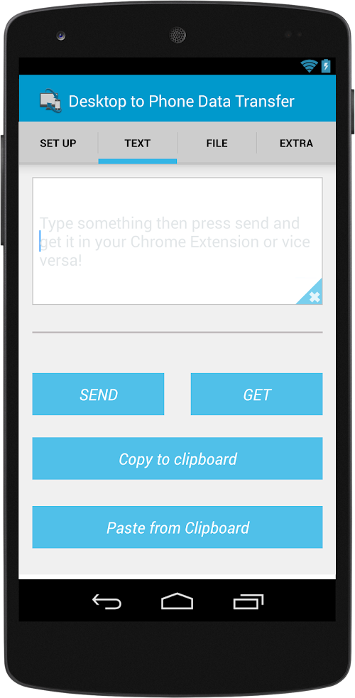Send any kind of data such as text, password, url, image, video or whatever you need from your Desktop to your Phone or vice versa.