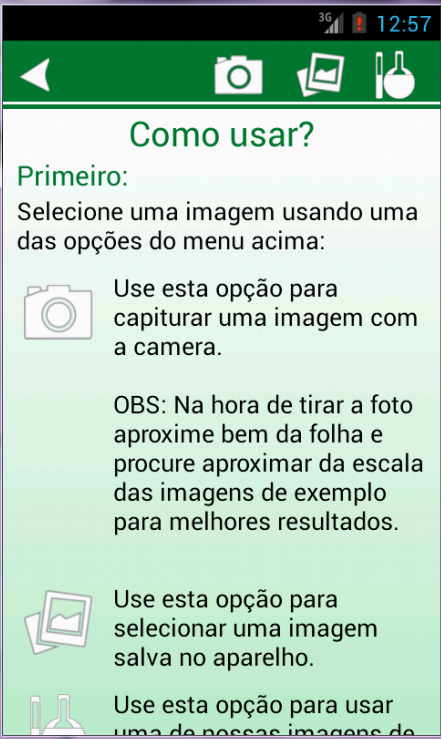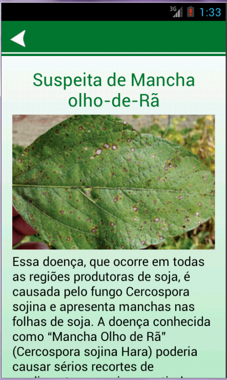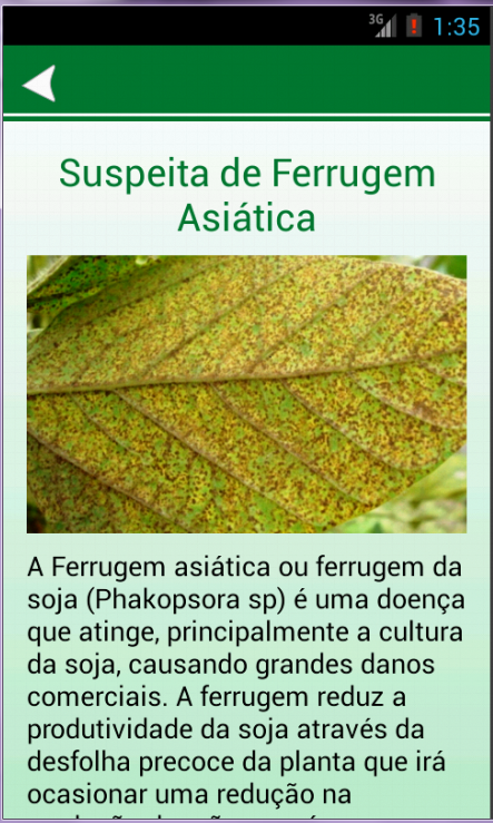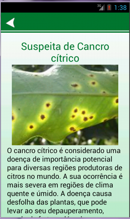 At the time the application is set to indicate the possibility of two types of pests of soybean (eye frog and rust), and four types of citrus pests (leprosy, scab, canker and melanosis). From now on we will be increasing the bank illnesses, so that it may soon be able to indicate the possibility of detecting the leading in the country and elsewhere in the world. The existing schedule allows detecting disease through images by simply increasing image database.