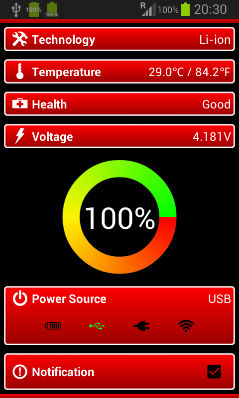 This app gives you information about the battery in your device. Monitor the battery level on the status bar and in the notification bar. Current battery temperature in Fahrenheit (°F) or Celcius (°C) degrees.