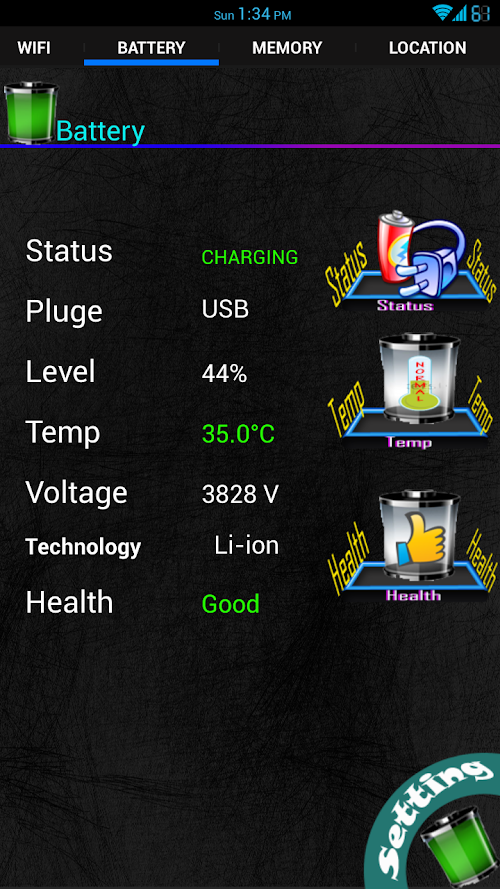 * Battery :- It includes status,level, temperature, health of battery ,etc.We can Directly go to Battery screen. It also Gives Graphical Representation of Battery.
