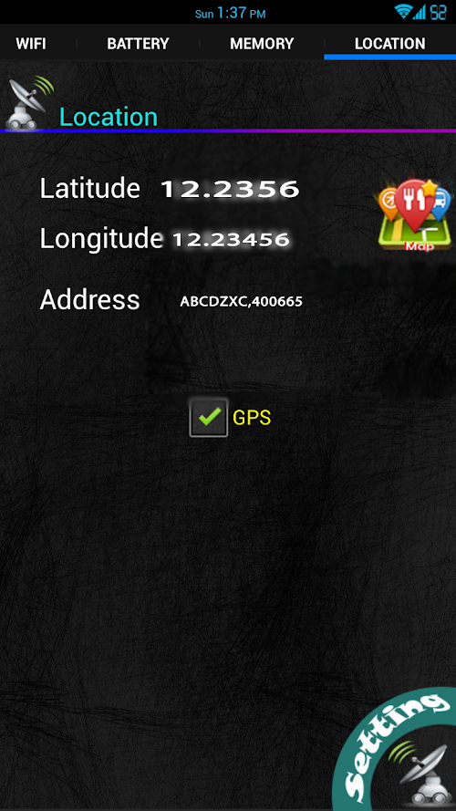 * Location :- Turn GPS ON/OFF. It gives latitude, longitude and your ADDRESS information. It allow you to go to Google Maps, which gives your current location. You can open location setting directly.