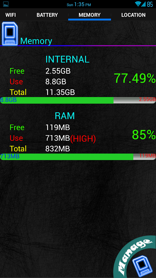 * Memory :- It gives detailed information of Internal Memory and Ram storage. From this we can go to app section which gives details of all the installed apps.