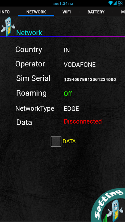 * Network Info :- Turn data ON/OFF. It also gives information like Country, Operator Details and whether we are in roaming or not etc. We can open Network setting from the app itself.