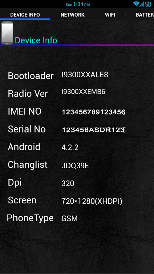 [Note :- Radio Ver. Requires API 14+ and Serial No. Requires API 9+ If you are using this app on any API below these specifications then you will get "--"or "Unknown" for respective field]