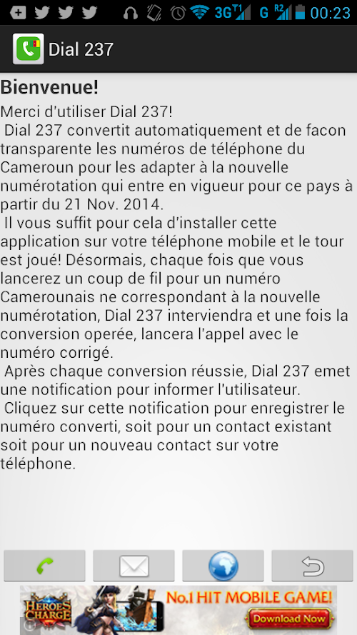 All you have to do is install the application on your mobile device and from that moment on, every time you will dial a Cameroon phone number that does not follow the new numbering scheme Dial237 will automatically convert that number and place the call. After a successful conversion Dial 237 issues a notification to inform you that the number was modified before placing the call.