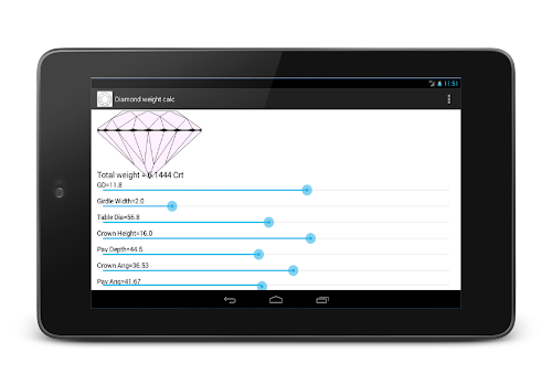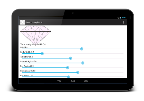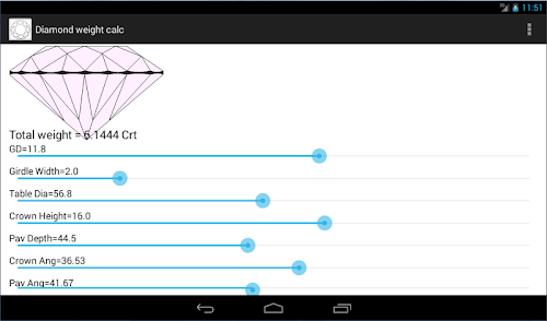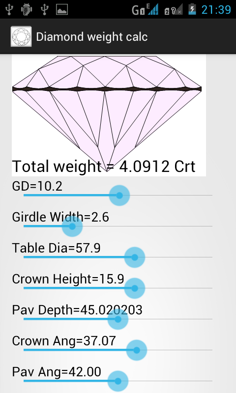 Diamond weight calculator calculates carat weight of diamond or gemstone base on Diameter, Crown height, Pavilion depth, Girdle width, Table and angles. You can change values by scrolling their sliders. You will see immediate measurements of caret weight on screen.