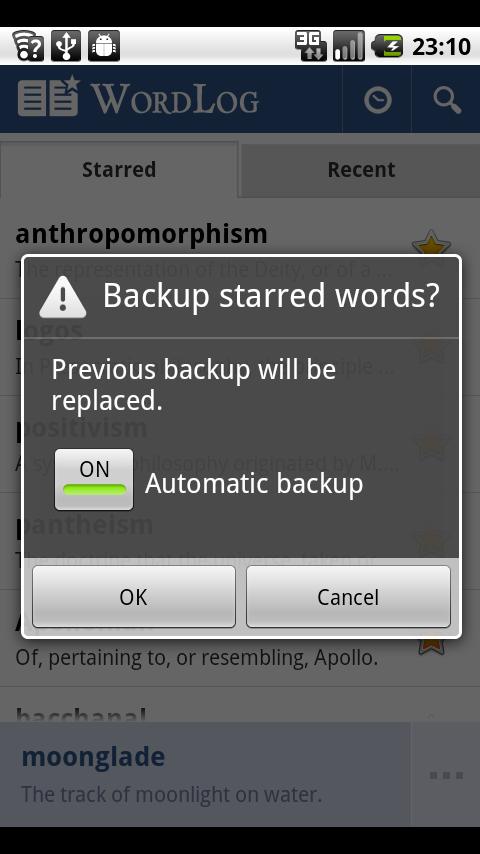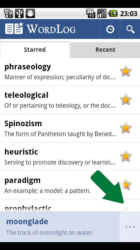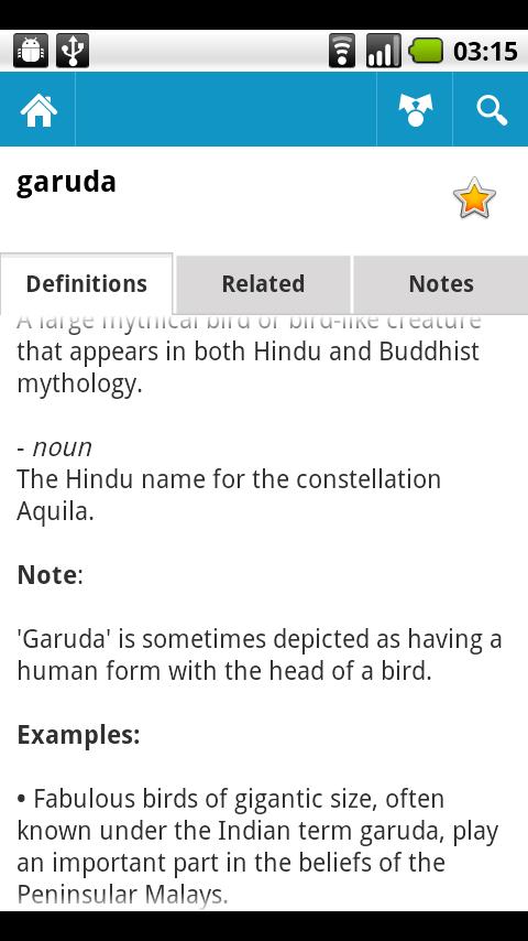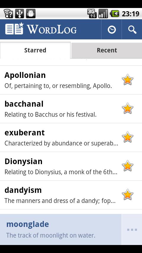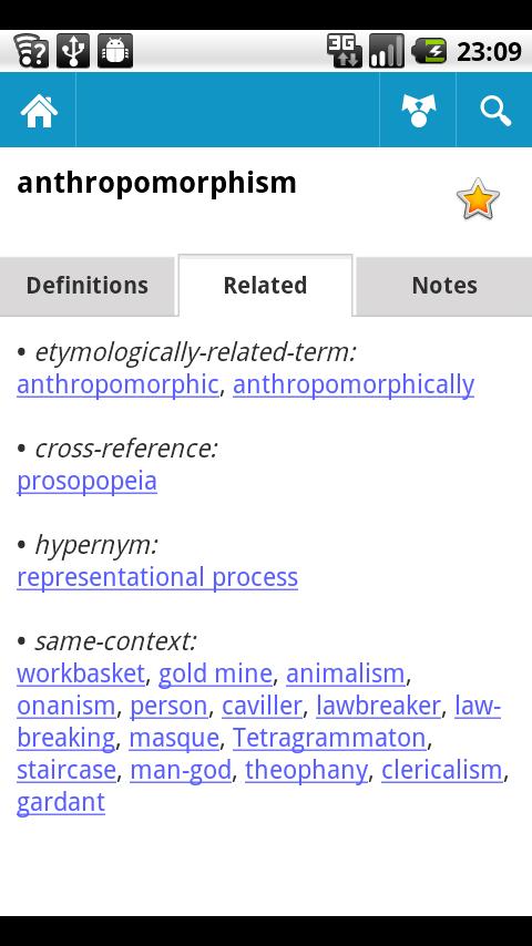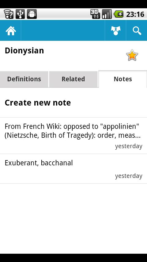 Encountered a word in a book that you don't know, or forgot the exact meaning of? Then look it up, bookmark it, and never lose track of it again. You can then navigate to other related words, including synonyms, hypernyms, hyponyms, verb-stems etc., thereby also broadening your general culture. Add notes to each words (e.g. "Read it in War and Peace, p.203, in the Fall of 2011), and create your own, custom dictionary following you everywhere.