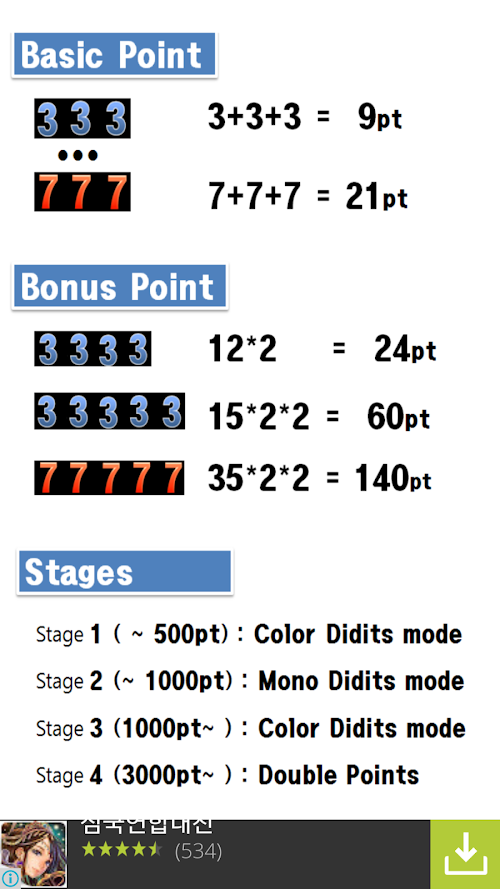 - Stage 1 ( 0pt ~ 500 pt) : Color Digit Mode