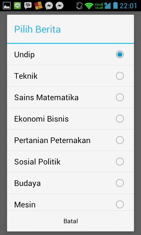 Dipo News is an android apps that contains newses in Diponegoro University. This apps serves many source categories. We can change the souce of news as we want. The sources are from the faculties in Diponegoro University. Beside, also from many departments in Diponegoro University. For you know, Diponegoro University has 11 faculties and each faculty has more than one department. So , it has many news. Last, we can share the news to others with many tools that installed in our gadget like FB, BBM, WA ,Line etc.
