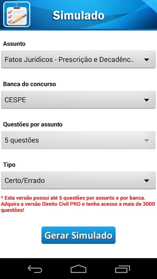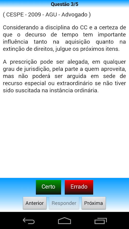 The application is focused for each area of civil law and contains hundreds of questions with feedback from previous contests. With it, you can: