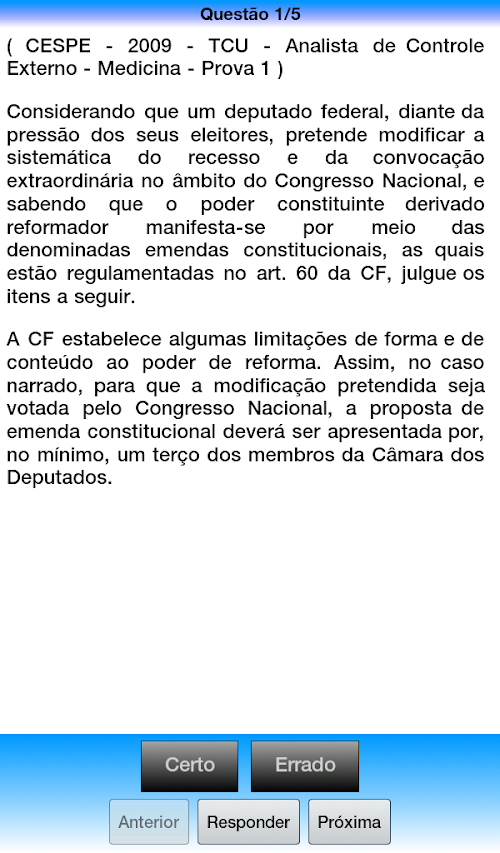 The application is focused for each area of constitutional law and contains thousands of questions with feedback from previous contests. With it, you can: